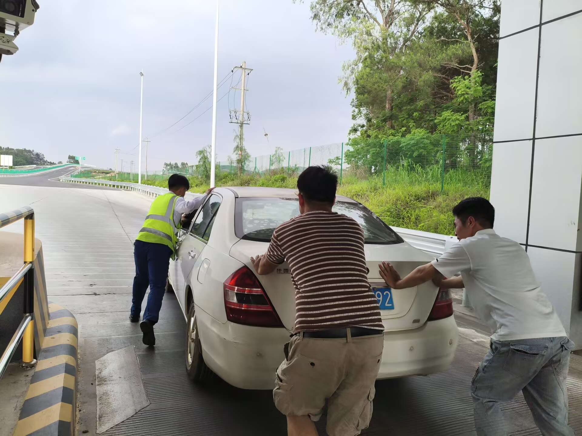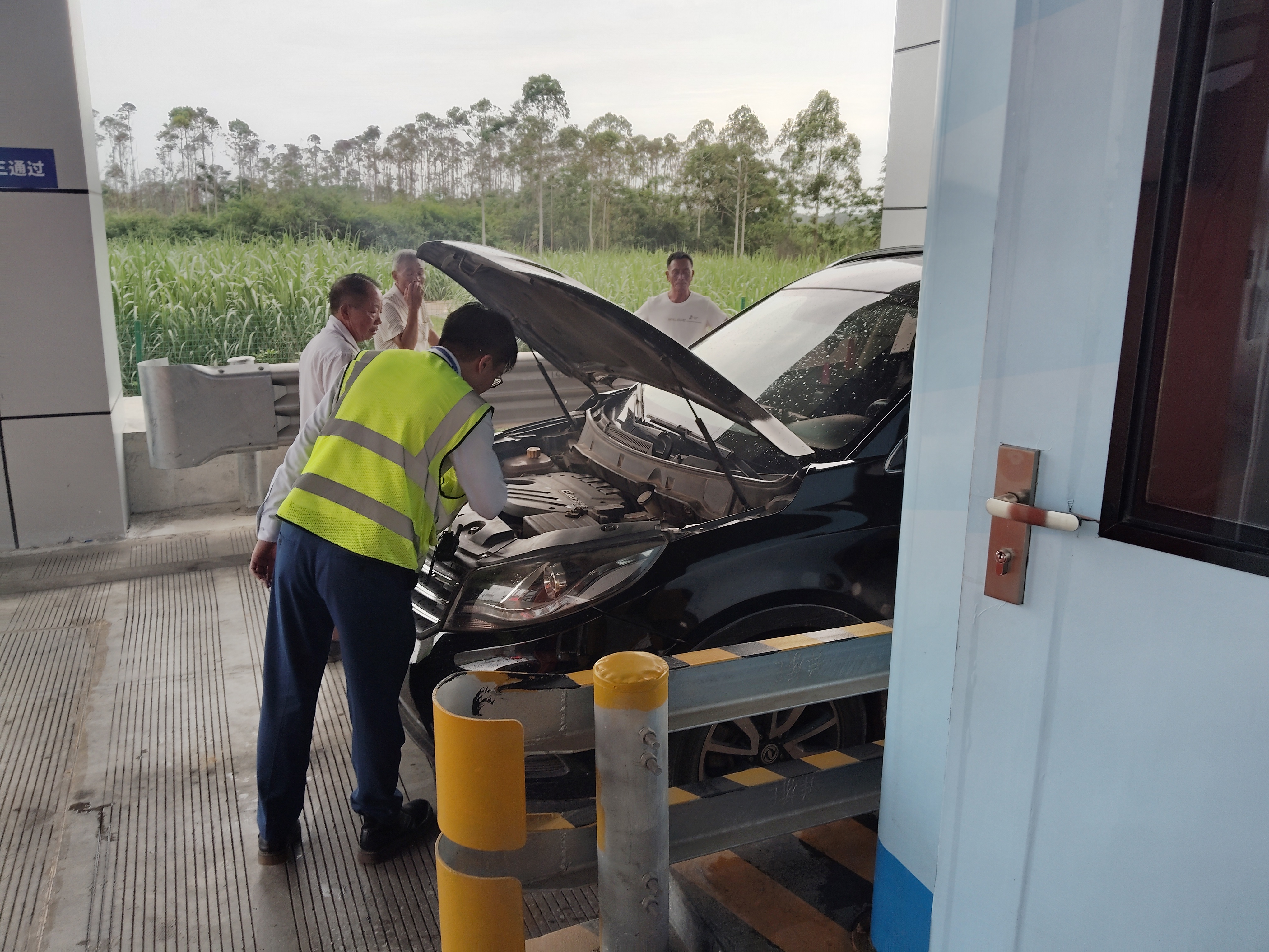 6月14日15時許,在林橫高速洋橋收費站,一輛小轎車在下高速時因發(fā)動機故障滯留在車道中并伴有白煙冒出,因事發(fā)時正逢暴雨,情況險急。當班收費員周秋吉、吳星煒察覺異常后第一時間上報監(jiān)控中心并開啟備用車道,迅速引導(dǎo)后方車流安全有序轉(zhuǎn)移,同時取用滅火器隨時準備應(yīng)對突發(fā)情況。在確認車輛無法啟動且白煙仍在持續(xù)冒出時,收費員冒雨協(xié)同司乘將車輛推離車道,轉(zhuǎn)移至收費站外廣場安全地帶停放,并幫助司乘聯(lián)系拖車,暖心服務(wù)讓司乘連連“點贊”。